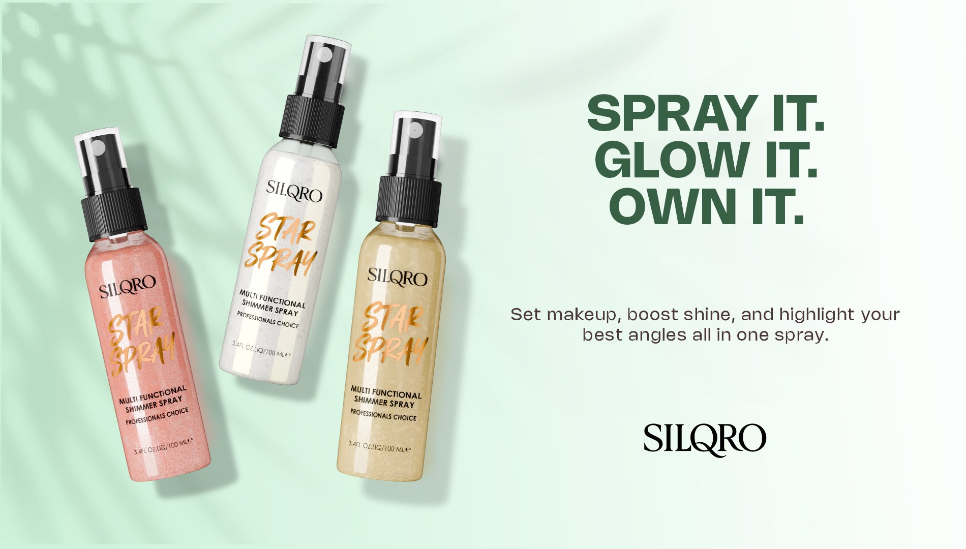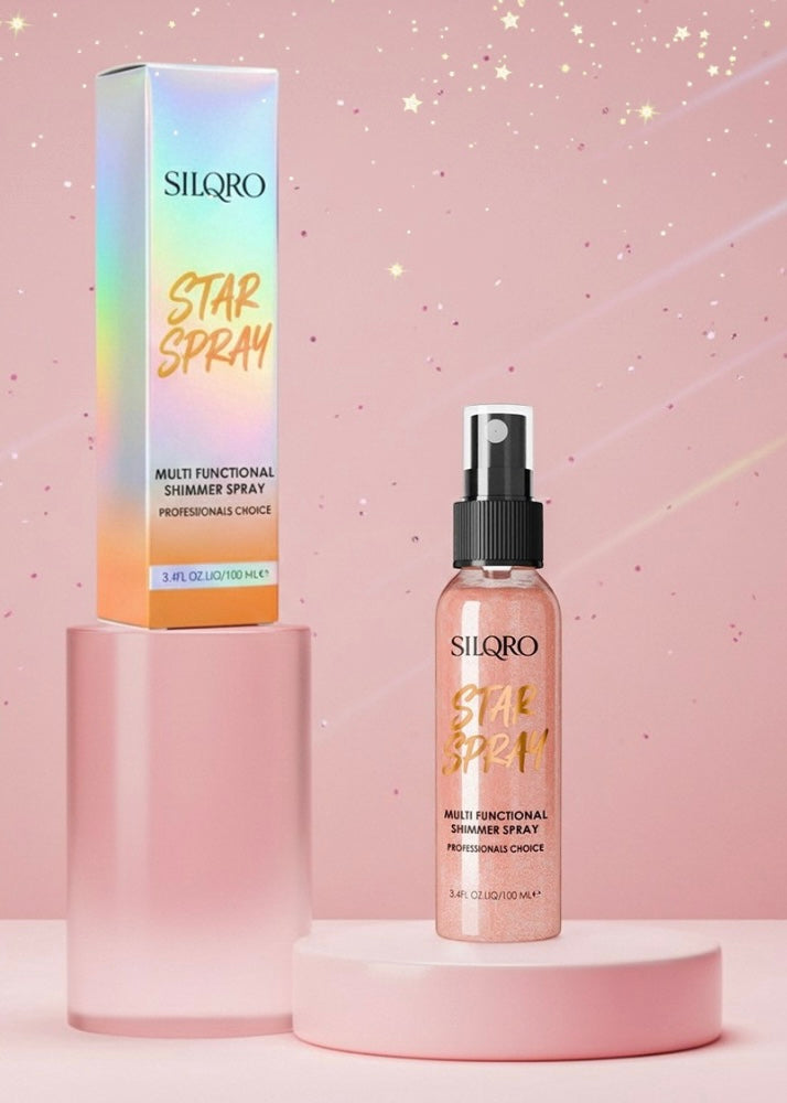 Meet the professional’s choice for a flawless finish. SILQRO Star Spray is a weightless, multi functional setting spray infused with ultra fine shimmer. It locks in makeup while delivering a natural, dewy micro glow. This non tacky formula brings a gorgeous glow from head to toe perfect for face, hair, and body.